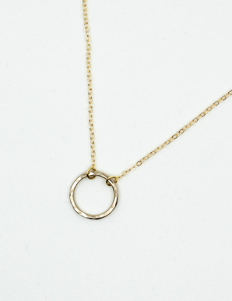 Hammered gold plated circle wire pendant on a 24k gold plated chain.